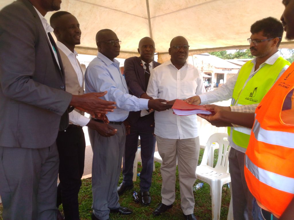 Apac Resident District Commissioner Andrew Onyuk (centre) together with Apac Municipal Mayor Patrick Ongom Eyul, Town Clerk Paul Muboki and Senior Engineer Eng. Francis Odongo hand over the site and Bills of Quantities to SAK Contractors